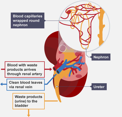 The kidneys functions begins as we eat and drink anything. Once the body consumes the nutrients from the food we eat, all the remaining material become waste products. These wastes either winds up in our blood or has to be filtered out. As the blood is constantly circulating inside out body with each heart-beat, the kidneys - along with its millions of nephrons - constantly filters our blood to clean it from the wastes and remove the extra fluids. These extra fluid and waste becomes urine and travels from the kidneys down the ureters into the urinary bladder which finally passes out through the urethra.